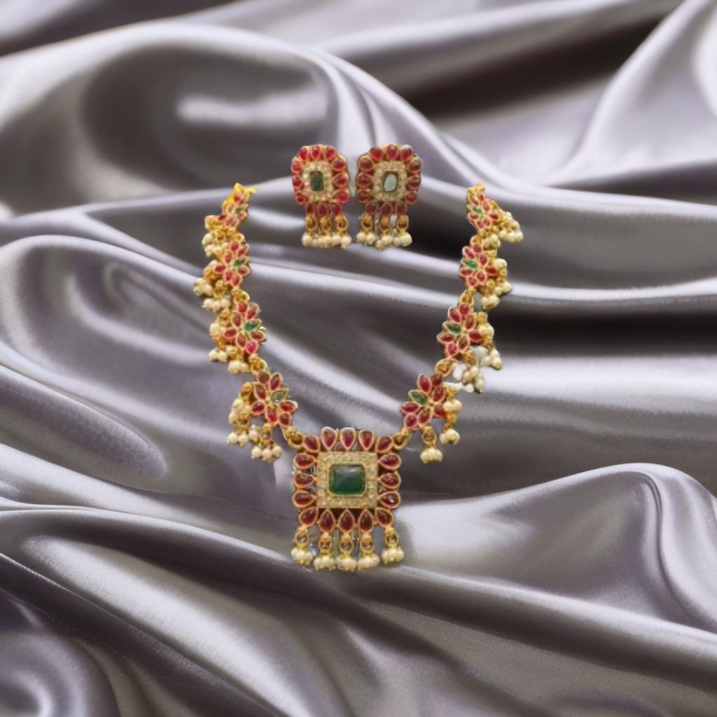 Antique Kundan Necklace Set with Green Stone Centerpiece & Pearl Drops