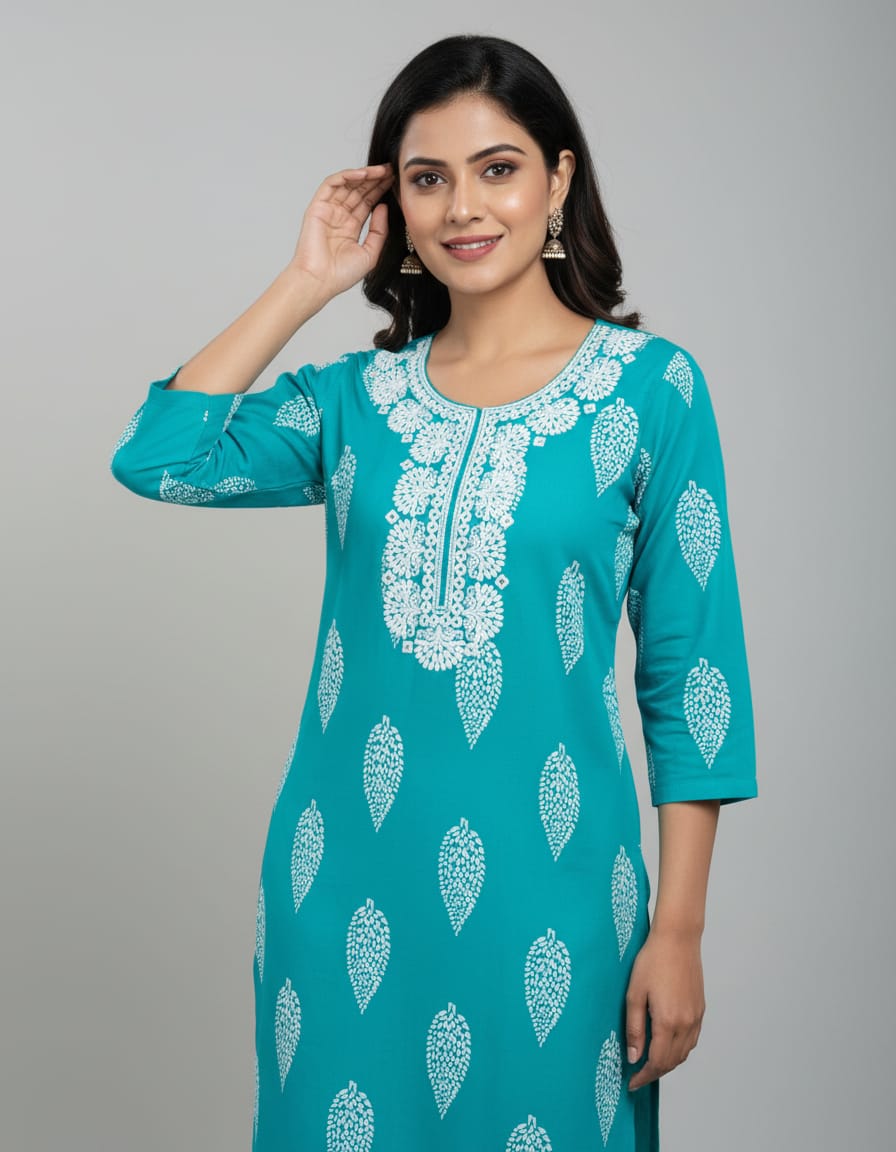 Women Blue Cotton Chikankari Embroidered Kurti